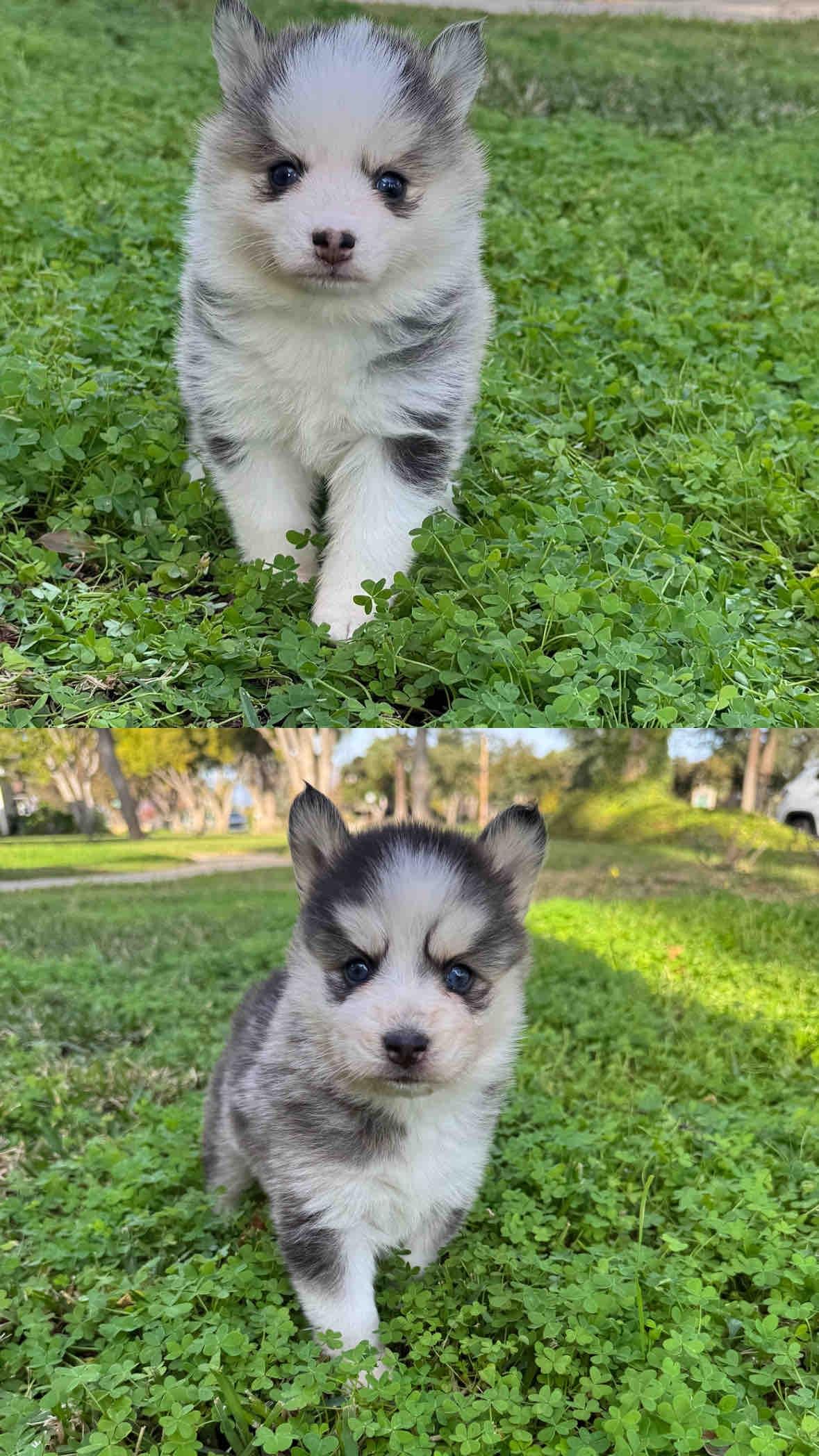He's a toy black and white wooly coat Pomsky at 8.9lbs. He's has a loving temperament.