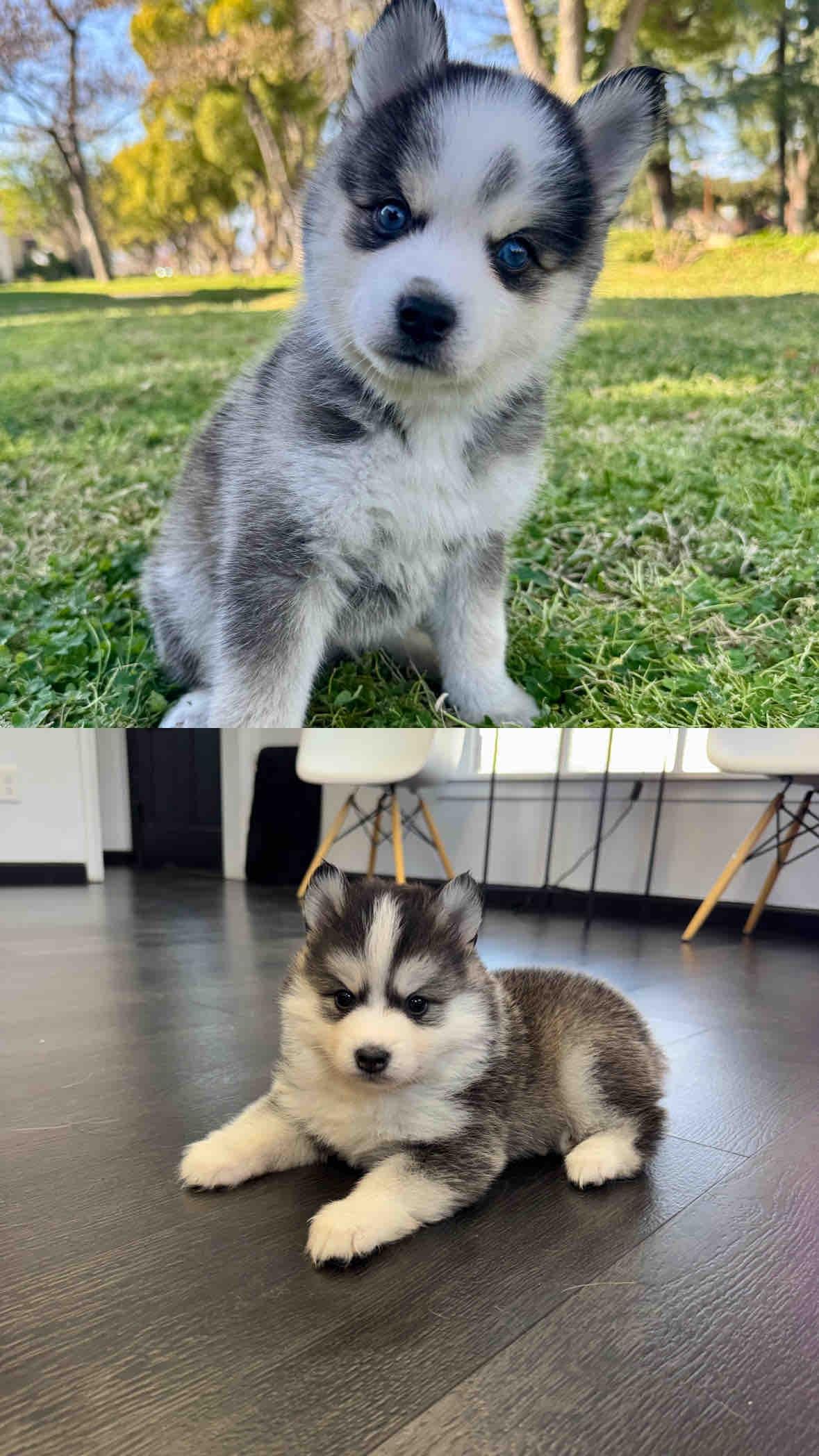 She is a mini Black and White Pomsky with Blue eyes.