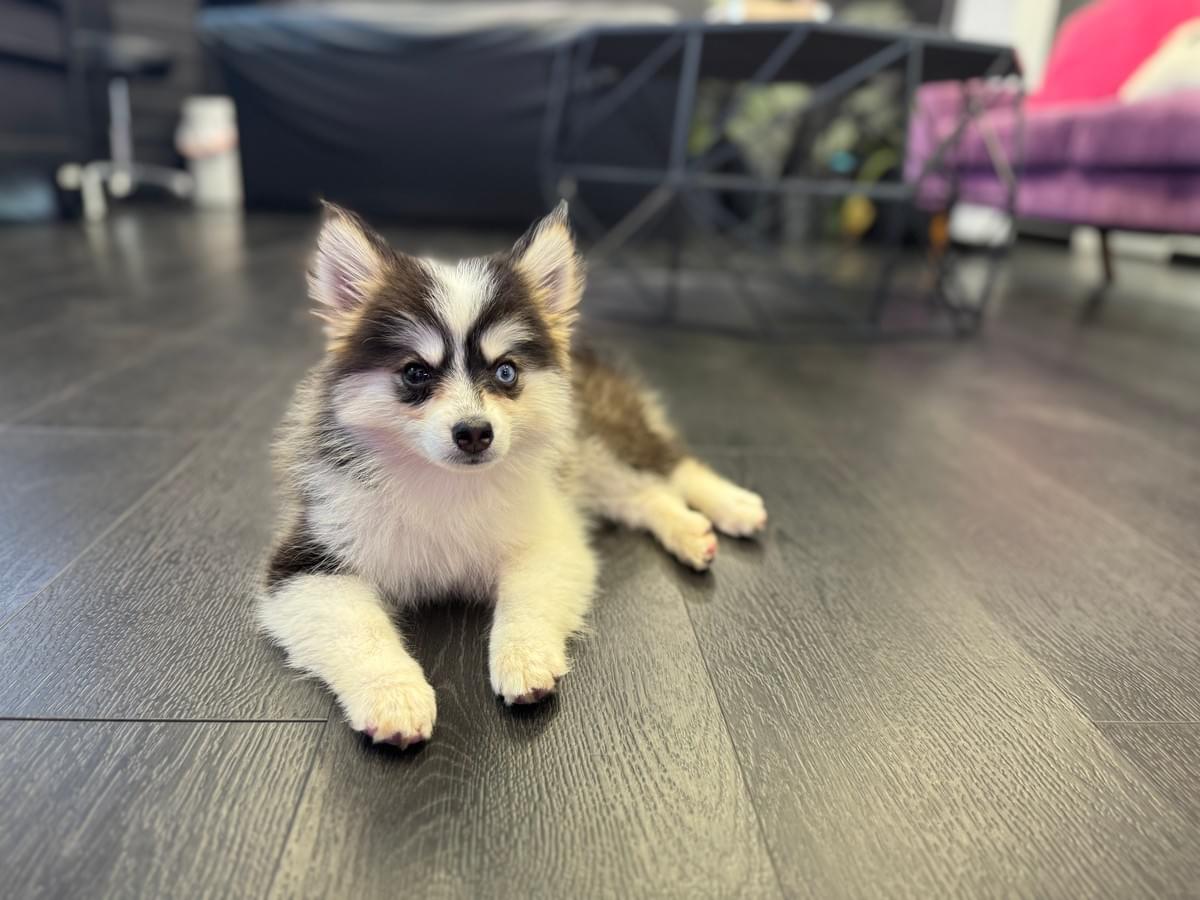 She's a Black and White coated Toy Pomsky averaging 6lbs when full grown with brown eyes. Shes the perfect lap dog.