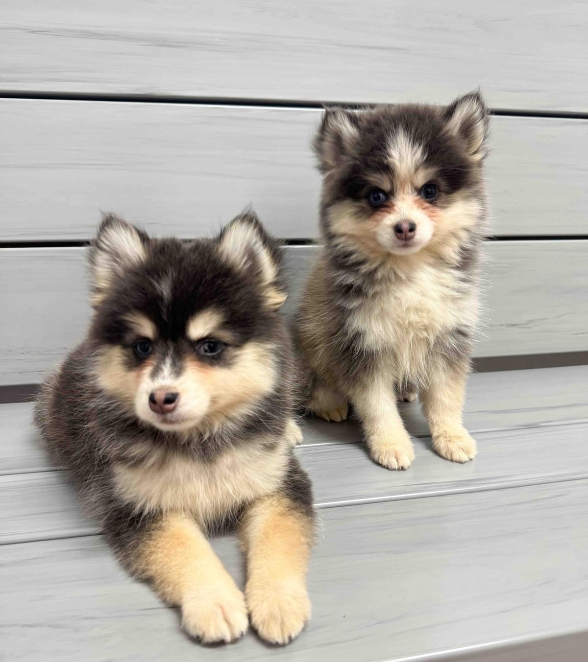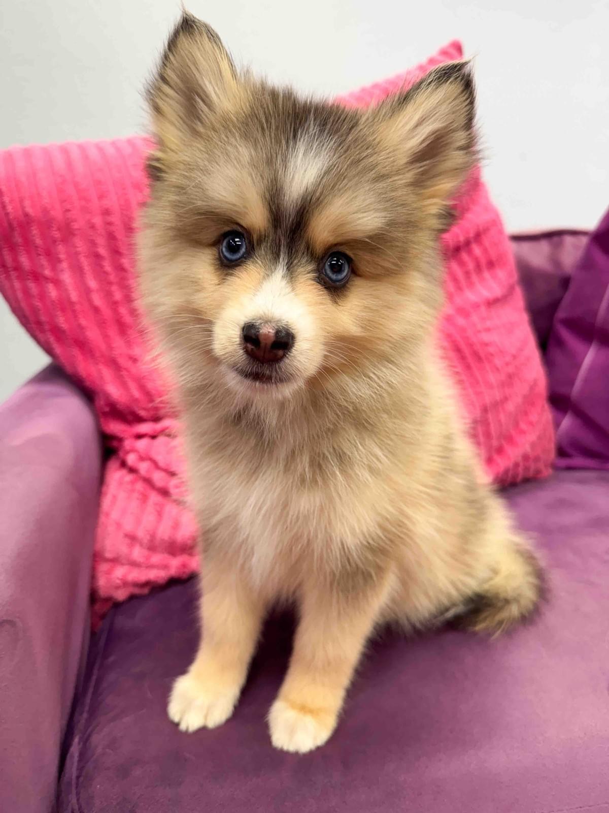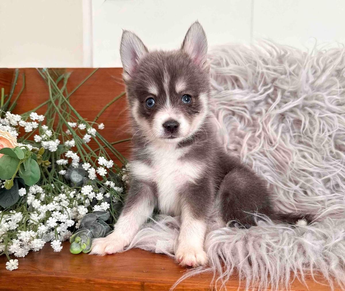 She's a Grey coated Toy Pomsky at 7lbs with Blue eyes. She's very sweet and loving. We Co Own her with Oceanview Pomskies.