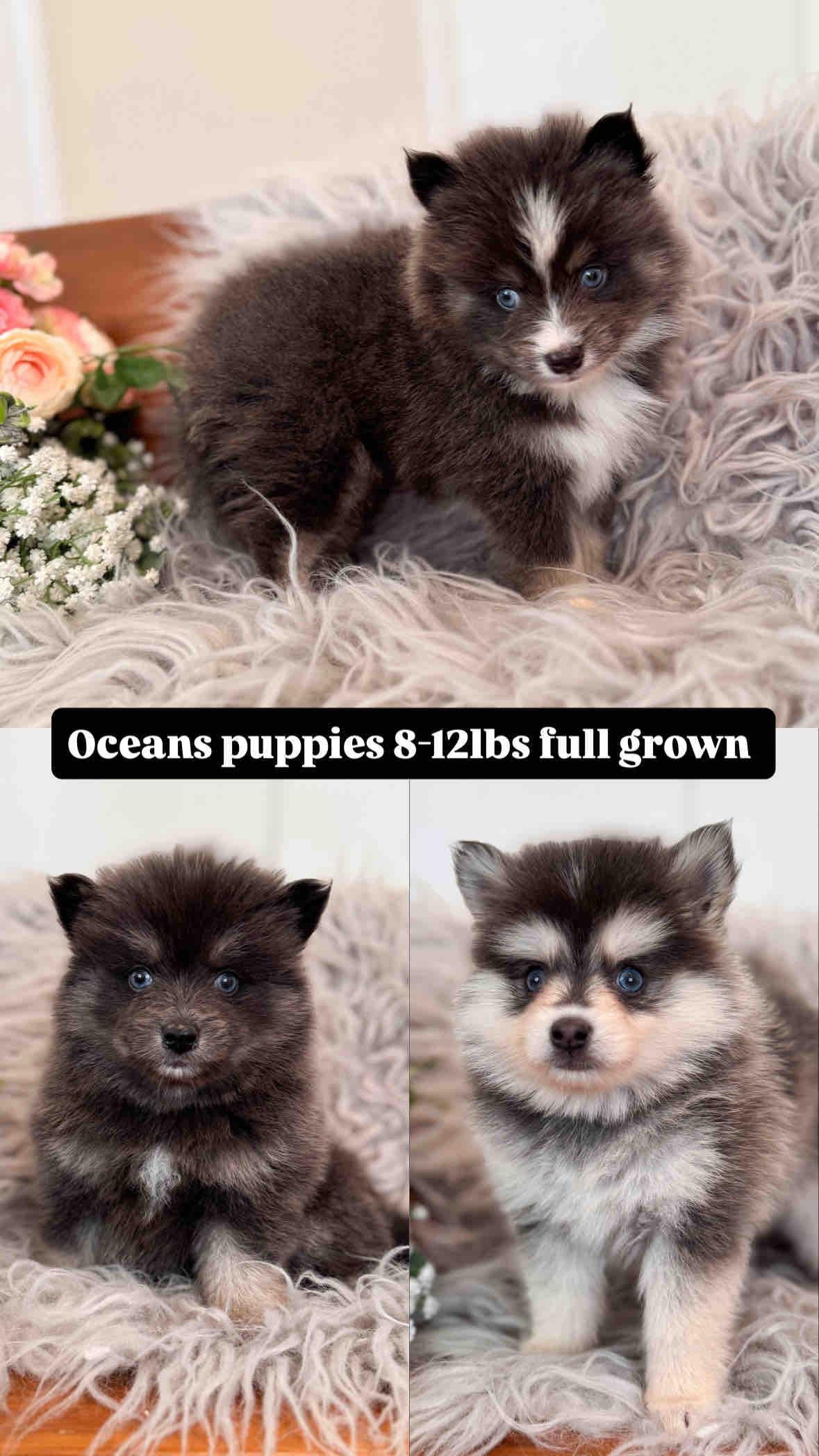 She's a Agouti coated Toy Pomsky at 6lbs with partial eyes. She's very sweet and loving. The perfect size to carry around. We Co Own her with Oceanview Pomskies.