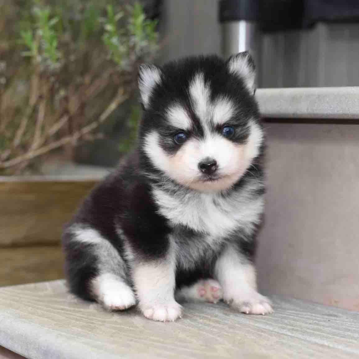 He's a toy black and white wooly coat Pomsky at 8.9lbs. He's has a loving temperament.